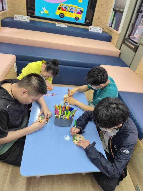 북버스체험에서 독서를 하며 알록달록 색을 칠하며 예쁜컵받침대를 만들었습니다. 좋아하는 책을 보며 재미있는 시간이 되었습니다